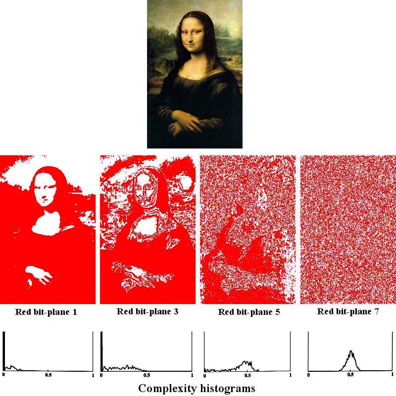 The picture below (Mona Lisa) is a typical color image. Some of its red bit-planes are shown together with the complexity histograms, where "Red bit-plane 1" designates the MSB (the uppermost bit-plane) of Red color. The lower planes look almost all nose pattern. Complexity histograms of higher planes concentrate in the left side area (the area the complexity is less than 0.5), while in the lower planes histograms centralize at the center (around 0.5 area).