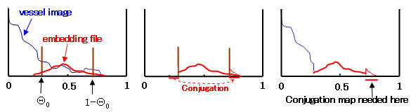 この模式図からも分かりますが、(C)に於いて、複雑さが 1-Θ0 よりも大きい画像ブロックには、Conjugation の結果によるものと、元からそのような複雑さを有していたブロックが混在します。従って、埋込みファイルを抽出操作で正しく復元するには、埋め込む前に、あらかじめ Conjugation Map データを作成しておき、そのデータも Vessel Image の何処かに埋め込んでおく必要があります。